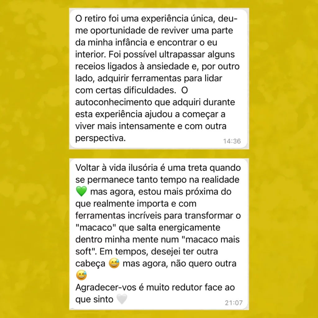 Nos retiros MINDFUL ESCAPE, as barreiras caem e o portal para aceder às nossas almas abre-se. É o momento perfeito para nutrires o teu corpo, mente e espírito, num espaço seguro, rodeado por uma comunidade acolhedora.